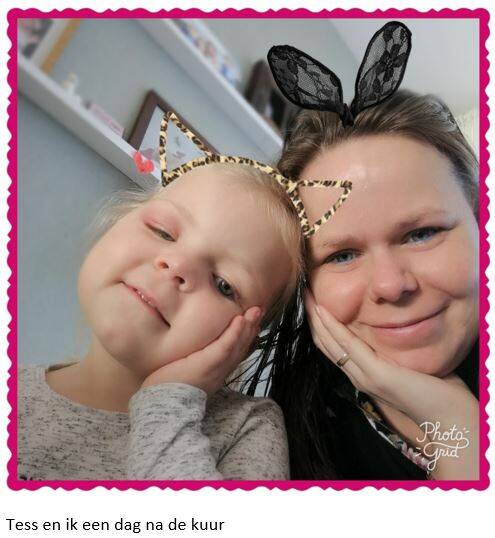 Vrijdag 3 november mijn 5e kuur... De 1e Docetaxel kuur. De eerste 4 AC kuren zitten erop. Wat heb ik toch tegen deze kuur op gezien... En weet je, zo zwaar als de eerste week was bij de AC kuur, ik wist wel waar ik aan toe was, ik wist wat ik kon verwachten en welke klachten ik zou gaan krijgen. Nu was alles weer spannend, welke klachten ik, wanneer zou gaan krijgen. De Donderdag van te voren nog bij de oncoloog geweest en mijn witte bloedcellen waren nog niet hersteld, ondanks de neulasta injectie, die ik krijg zodat het beenmerg gestimuleerd wordt om witte bloedcellen aan te maken. Een zo'n spuit kost ruim 1200 euro... maar dan sturen ze wel een verpleegkundige mee om de injectie toe te dienen. Luxe hé ;) Maar goed even terug naar de witte bloedcellen... Ik mocht van de oncoloog toch beginnen met de kuur omdat deze kuur er minder om bekend staat dat die de afweer tot zo'n laag punt brengt. Das fijn. Op de ochtend van de kuur werd Tess wakker met een dicht ontstoken oog... ook dat kon er nog wel bij. Omdat Tess in die week bloed had moeten laten prikken, waar ze heel angstig voor is... wilde ze absoluut niet naar de dokter, maar i.v.m. mijn lage weerstand kon ik het risico niet nemen om er nog een infectie bij te krijgen dus ik maakte een afspraak bij de huisarts... Nog 1 plekje om 10.15u, een kwartier voordat ik zelf in het ziekenhuis moest zijn. Dat ging mij dus niet lukken en vroeg ik Cindy en papa om met Tess naar de dokter te gaan. Ze was heel verdrietig en heel bang. Ze kwam bij me op schoot zitten en ik moest huilen... Wat vond ik het verschrikkelijk dat ik haar niet op kon vangen en met haar naar de dokter kon gaan... en natuurlijk wist ik dat het wel goed zou komen maar weer huilde mijn moederhart. Ik wilde haar hand vast houden, haar tranen afvegen, haar troosten. Pas nu besef ik wat mijn moeder heeft moeten doorstaan doordat zij heel veel in het ziekenhuis heeft gelegen vroeger... ze kon heel vaak niet mee naar het e.e.a. met ons omdat ze in het ziekenhuis lag en moest dit uit handen geven. Jeetje wat moet dat zwaar voor haar zijn geweest. Eenmaal op de dagbehandeling aangekomen vertel ik de verpleegkundige in tranen dat ik er last van heb dat ik niet bij mijn dochter kan zijn, heel begaan zijn ze en ze snappen mijn gevoel, ze drukken me op het hart dat ik de volgende keer echt moet bellen en dat ik dan gewoon wat later kan komen, het zijn allemaal lieverds daar, zo betrokken bij iedere patiënt. Dan hoor ik dat ik bij deze kuur geen 1.5uur hoef na te koelen maar 20 minuten. Wat een feest! Mijn stemming is omgeslagen. In totaal hoef ik maar 2.5uur met die ijskap op mijn hoofd... is dat even een meevaller. Tijdens de kuur kwamen er wel steeds golven van misselijkheid over me heen maar ben verder goed de kuur doorgekomen. Zaterdag teerde ik ook nog op de dexamethason. Ik had een goede dag, zie de foto hierboven die ik samen met ons Tessje heb gemaakt. Maar vanaf zondag ging het bergafwaarts... ik ben niet zo hondsberoerd geweest maar wat een pijn heb ik gehad. Van mijn nek tot aan mijn bekken met mijn rug in het bijzonder... het werd met de dag erger en ik dacht alleen maar nog erger.